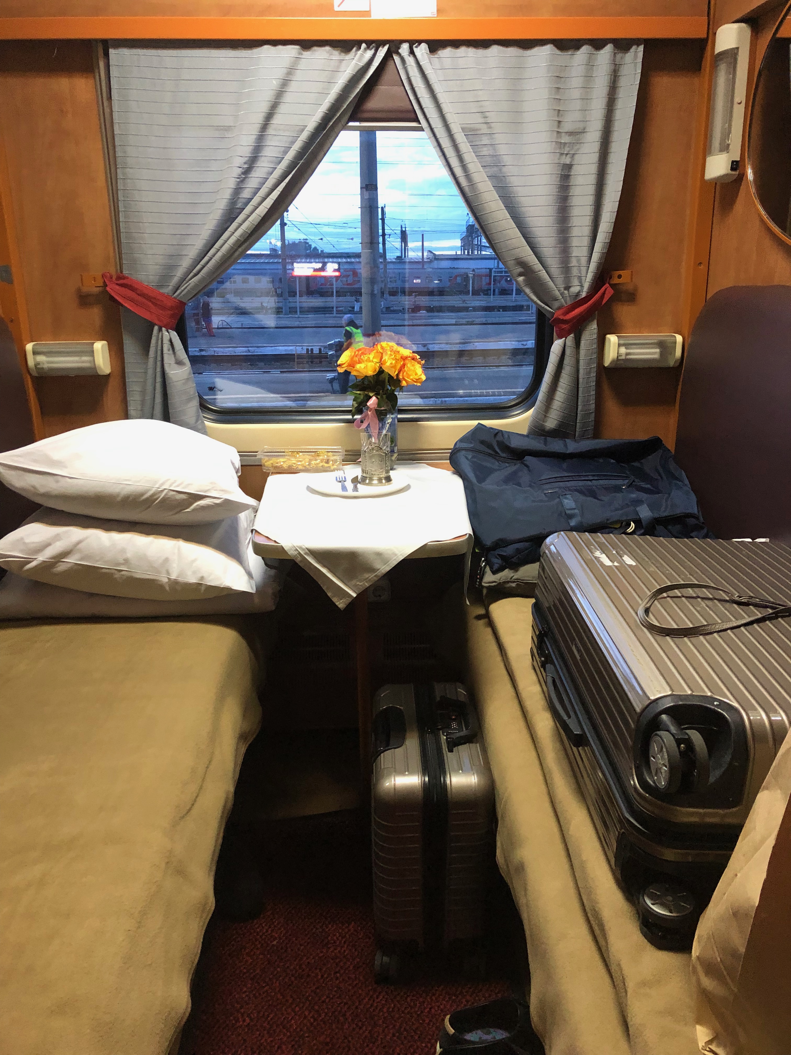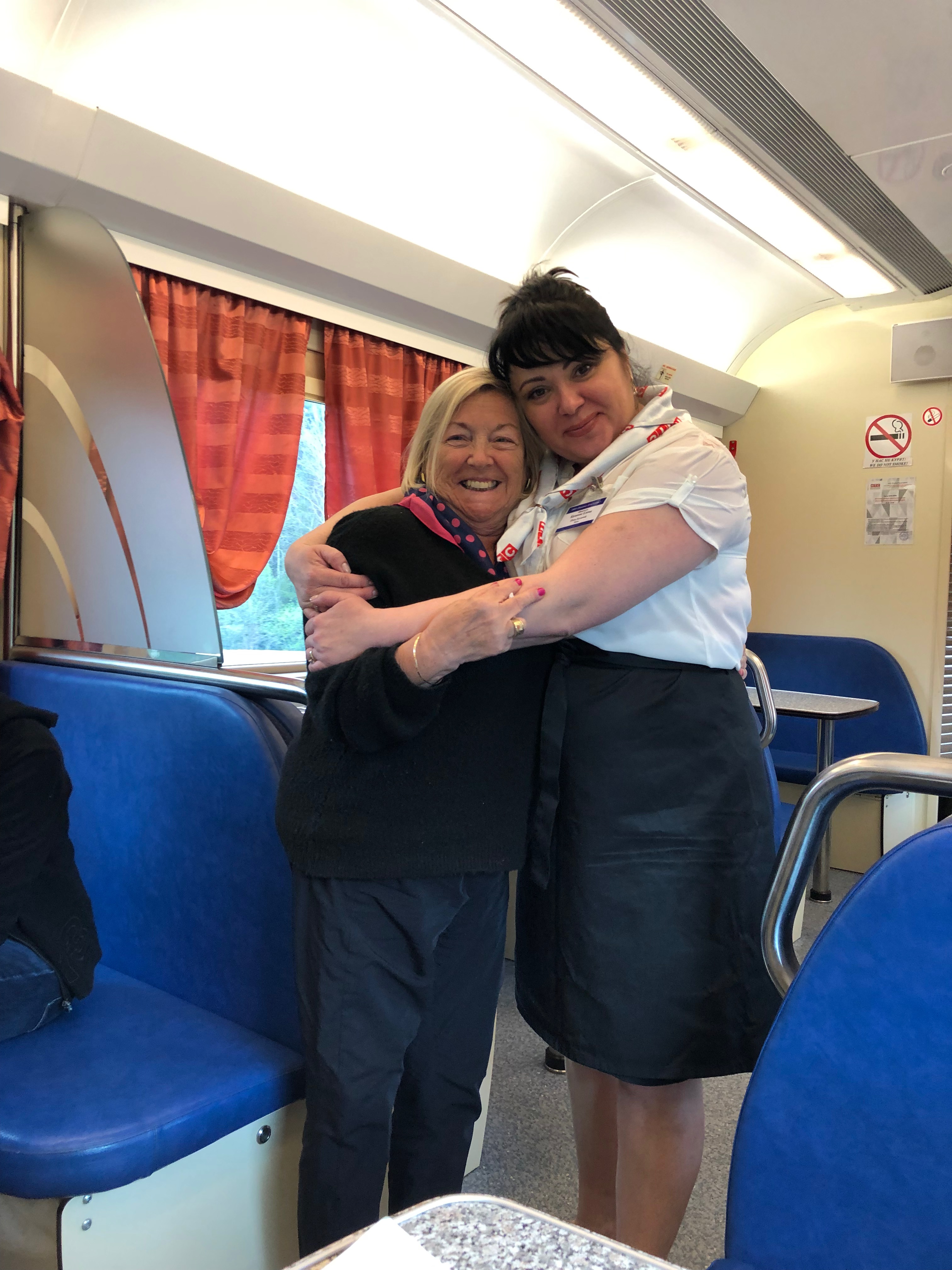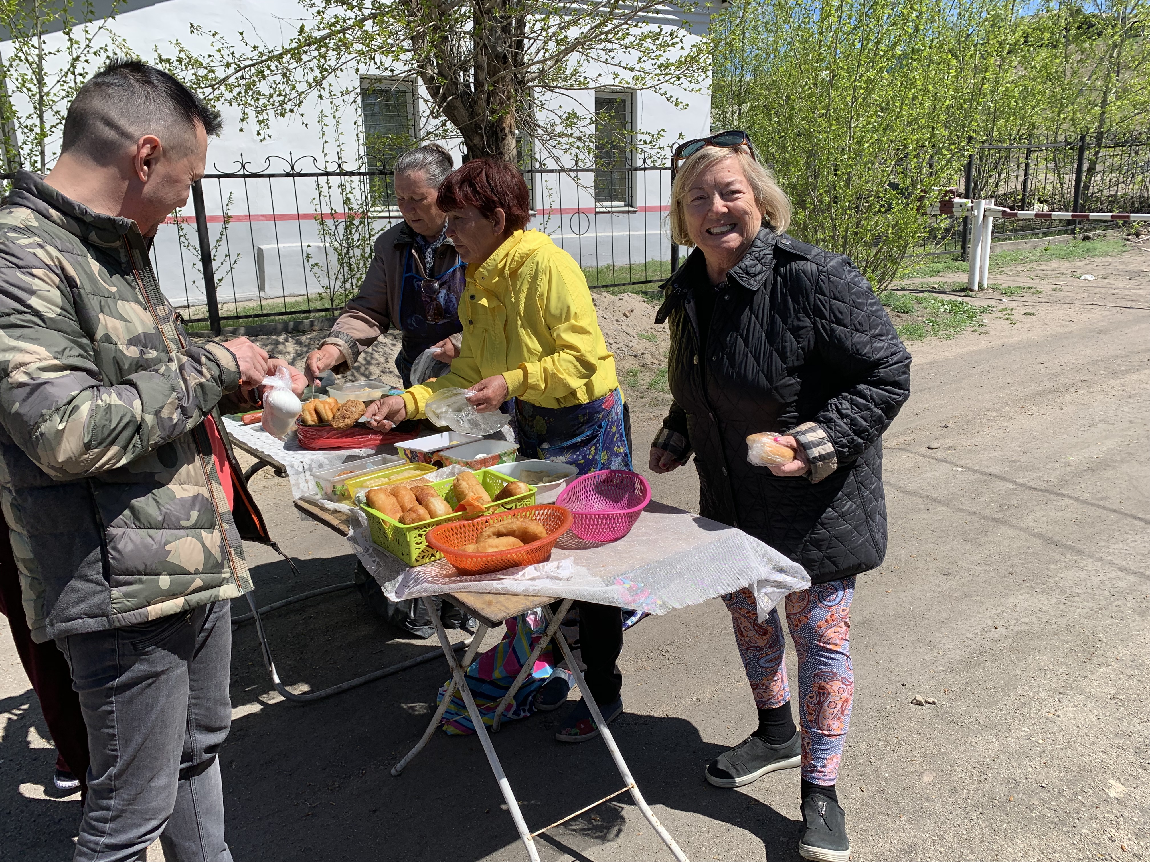 At many of the stations there are little Russian ladies selling homemade food. Everything from sausages to fruit and hard boiled eggs. Persuhkas stuffed with potato or meat or herbs. They were my favourite and you could eat them cold. They had what looked like hamburger patties, but no one knew what kind of meat it was….. maybe horse?? Been there, done that. So we stayed away from them. There were also cakes and sweets. Some of our group brought ramen noodles, and I discovered a Russian product that is like instant mashed potatoes in a small container with meat or onion that was very good. Just add hot water. It wasn’t exactly Michelin star food, but we were all fine and not hungry.