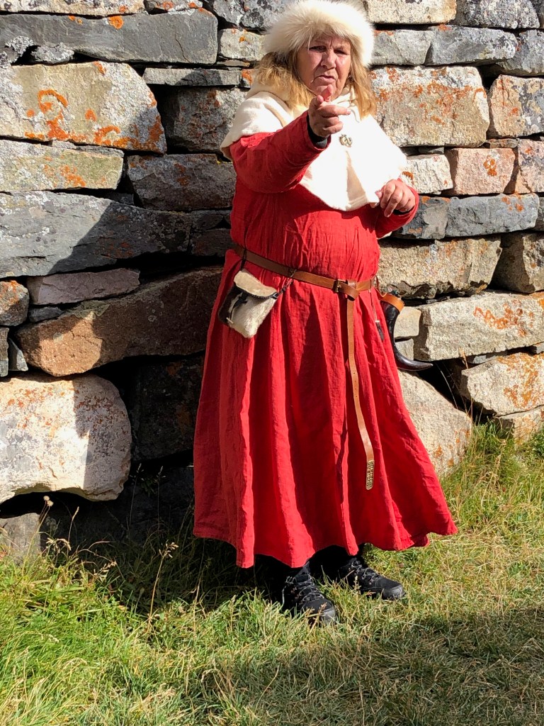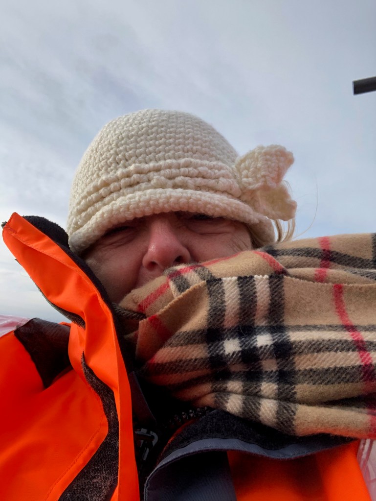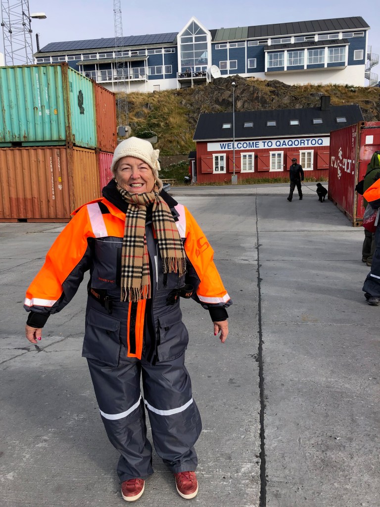 My tour to visit Hvalsey Church was interesting from start to finish. First of all it was 6C (42F) and it was windy and our transportation was an open rubber dinghy type boat. We had to put on something to keep us warm and they gave us a sort of hazmat suit. It looked like a serious snowsuit with reflective tape and velcro at the wrists and ankles. I was having trouble getting into mine when the captain of the boat came over and got me all tucked in and zipped up. At that point I thought I should say, I have to peeee!! It was hard to walk or bend and I felt that if I ever fell overboard I would float. Once we got underway, flying across the fjord for 30 minutes, I was very happy to have that extra layer of clothing. It was freezing!!!
