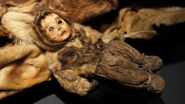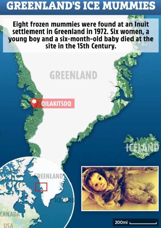 The article & photo I borrowed from the museum’s website. The ancient farmers, including a baby, who experts believe was buried alive at six months old, lived in Greenland 500 years ago. They were found by hunters at an abandoned Inuit encampment in 1972. The mummies still had their skin, fingernails, hair and clothing intact after hundreds of years. It’s believed the mummification process was accidental and resulted from the region’s ice cold climate. The settlement of Qilakitsoq, on Greenland’s wet coast, is 450 KM north of the Arctic Circle. Archeologists think the group died there sometime around 1475AD.