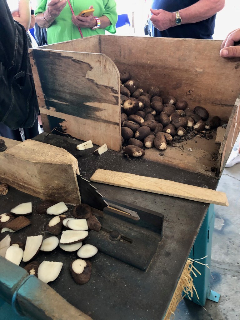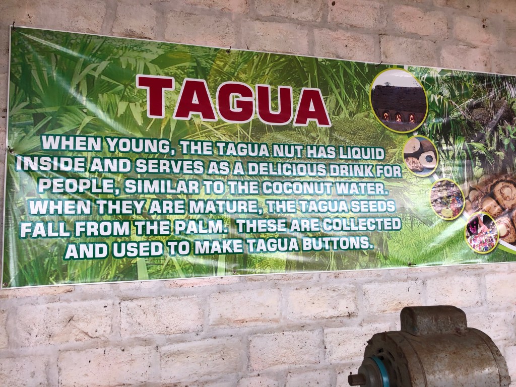 We also visited a Tagua plant. The nut from this palm tree, also known as the ivory plant, is very hard with a color and consistency of ivory. The nuts are fashioned into buttons. The material can be dyed. Buttons are still their main source of income, but now they also carve little animals and other small sculptures in an attempt to augment income and keep this dying art alive.