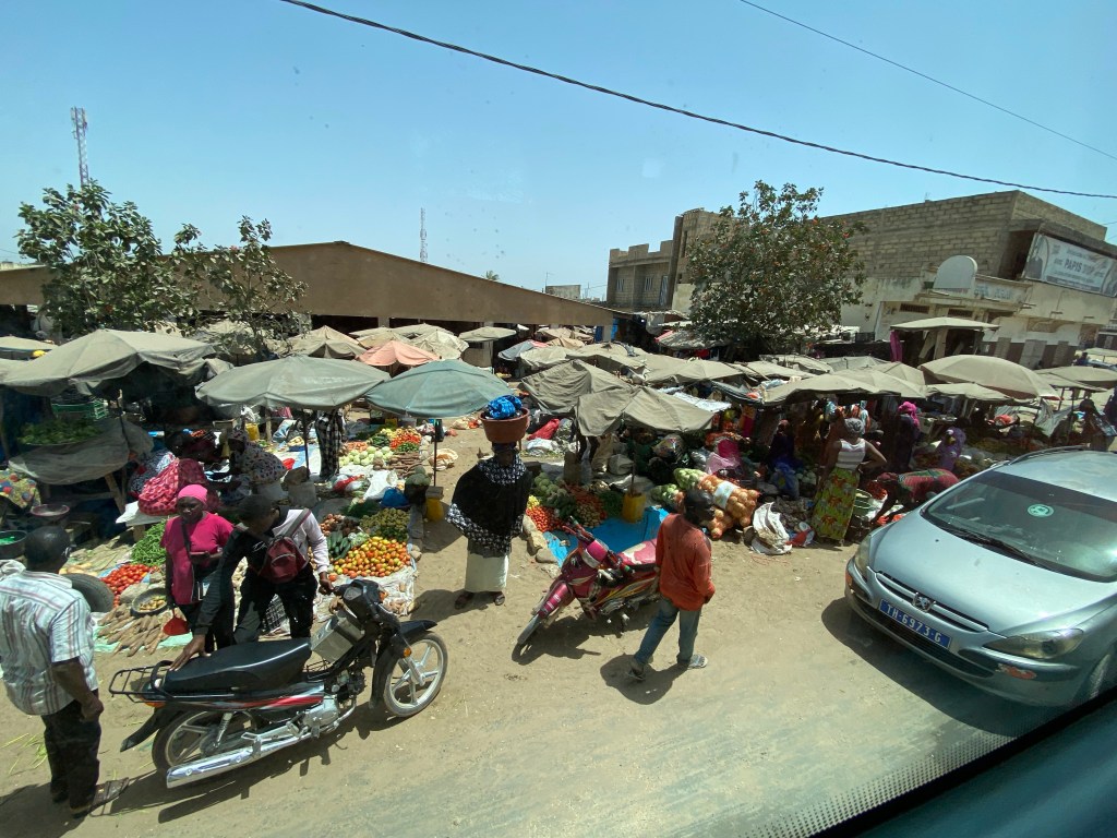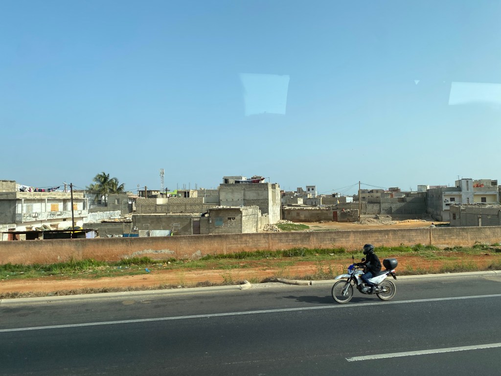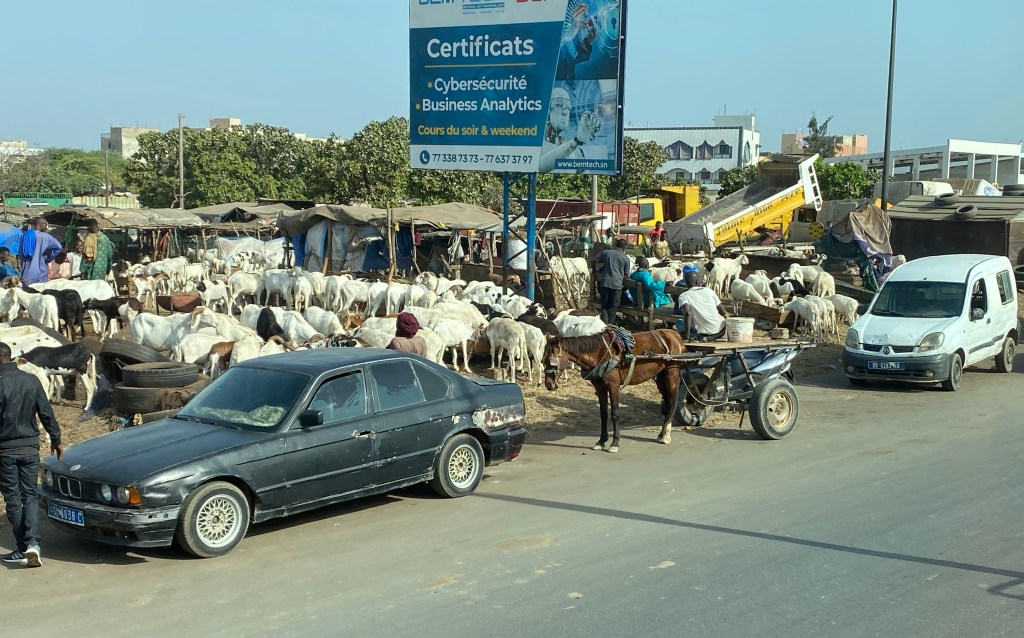 Our tour of Dakar took us through the downtown area. The markets we saw from the bus were varied, plentiful and busy. Our guide also told us the government is trying to build more housing for the people and we saw what looked like half-finished low rise apartments in many areas. In other areas, he told us that people would build so far and then work to get the money to continue and so on until it was finished. The construction industry is doing a booming business and there were many stores selling construction-related products like wood, cinder blocks and cement. The transportation of these products to the building sites is mainly done by horse and buggy and the horses vie with the trucks and cars, mopeds and buses for room on the narrow chaotic streets. It was really pandemonium in some places and though there were lots of cars and many little buses with riders overflowing out the back, it seemed like the majority of the people just walked.