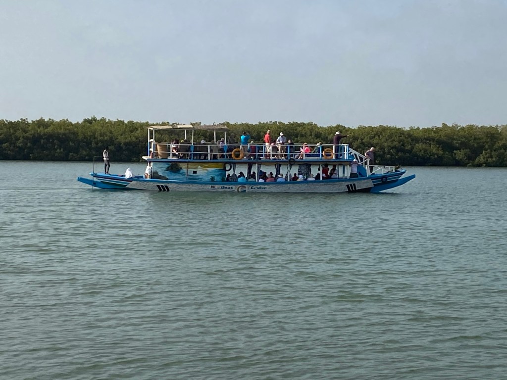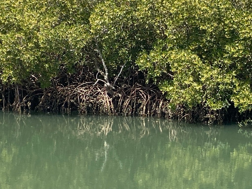 We also learned the mangroves that line the sides of the river create a growing place for oysters. The oysters attach themselves to the roots and when they are ready they are harvested, and only by women in small boats. Once the tide went out, we were able to see how the oysters grew. They are only harvested for local consumption and not for export. We also saw lots of birds.