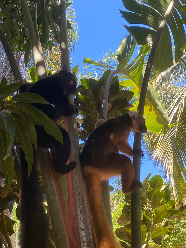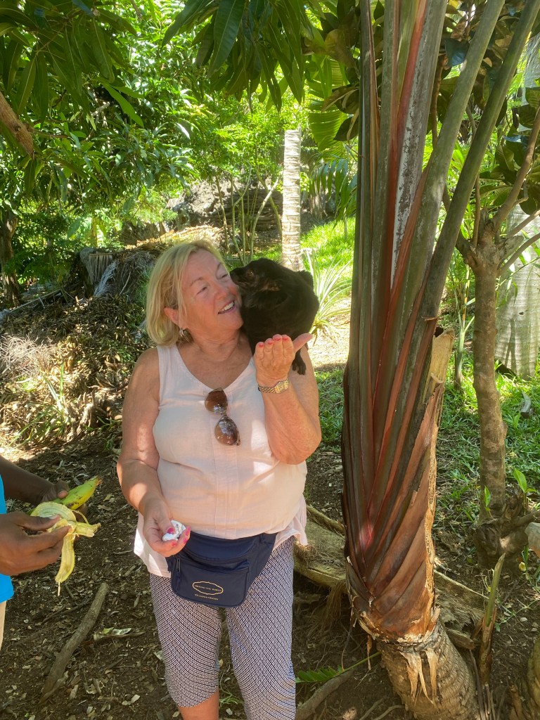 On our 2018 cruise, one of the big disappointments was we were not able to get into Madagascar. The ship cited ‘weather’, but we had also heard they had an outbreak of the Black Plague. Whatever the reason, I guess they were both good ones. But this time the weather is perfect, sunny with blue skies and calm seas. Our tender picked us up at the ship and we set off for Nosy Be and Lemurs. It is hot but worse, it is really humid. However, out on the water it is beautiful and we reach Nosy Be before we know it. From the water, we could see what looks like a fairly primitive village. They do have solar panels on some of the makeshift huts, but other than that we learn there is no electricity, no cars and I am not sure about indoor bathrooms!