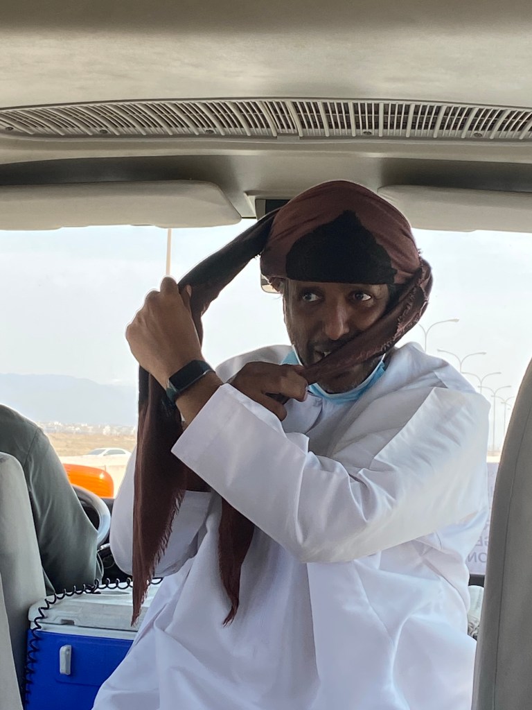 Our guide showing us how to tie a massar, the more formal headwear for men. He is also wearing a dishdasha. Mostly they are white and very plain. I think they are rather sexy.